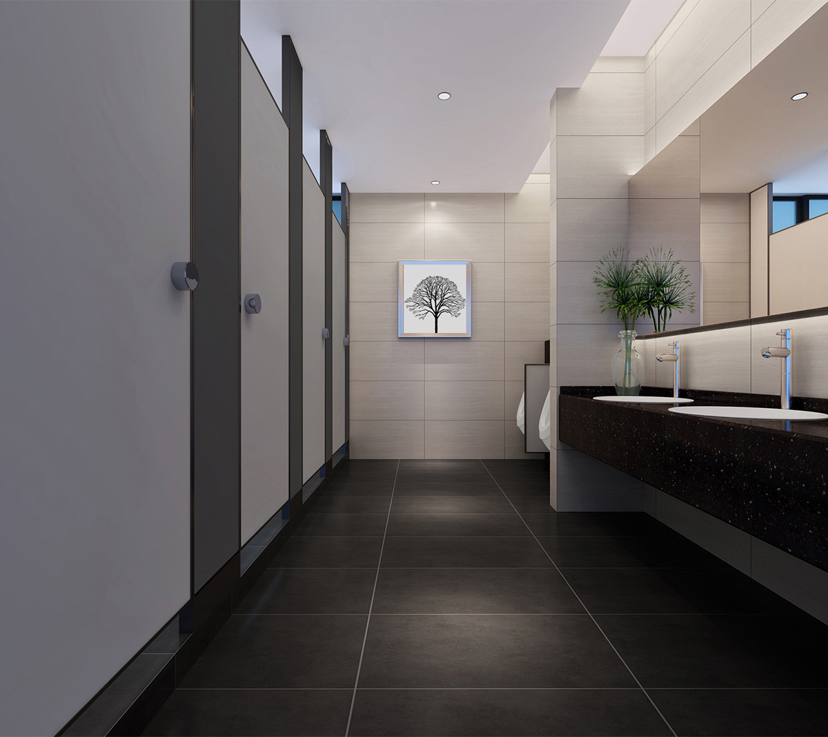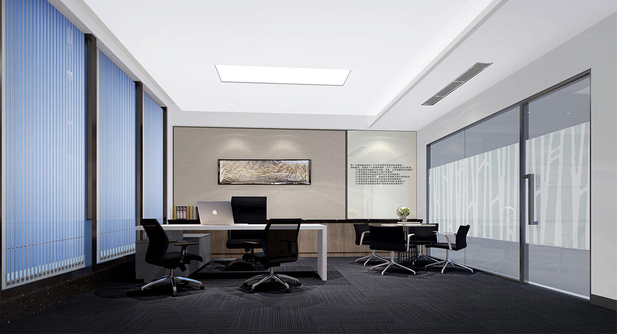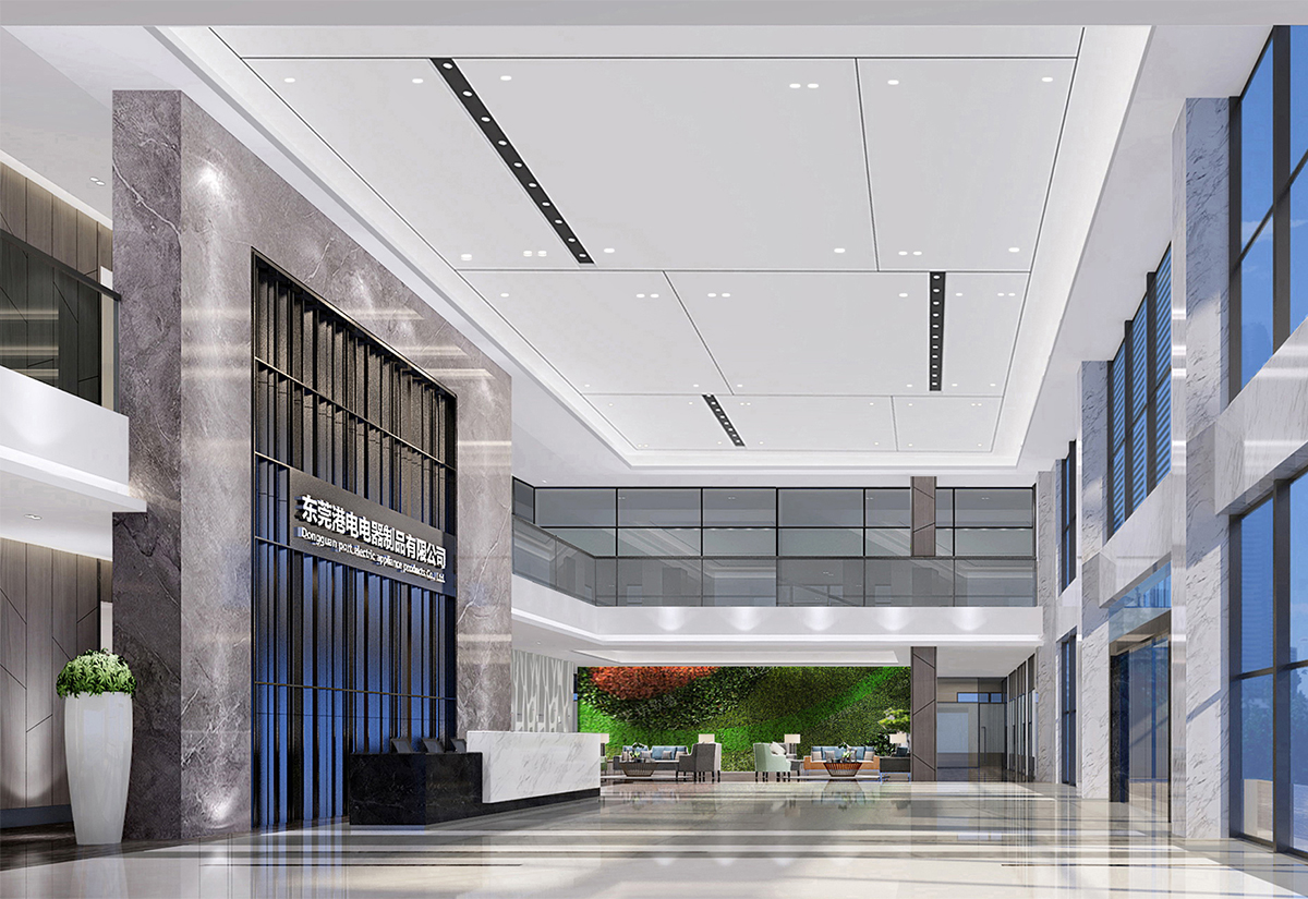 港电电器是一家以生产和销售小家电制品、电子玩具、快速闪灯、塑胶文具、听觉保护器的企业。本案在设计构思上采用:时尚、冷峻、节能、环保。材料上彩用:黑钢、灰色大理石、灰色玻璃。体现主题:环保空间、突出艺术形态、体现企业个性。主色调:黑、白、灰,这些都是朴素的颜色,却能表现出空间高雅、理性和高效。表现形态:树林,寓意企业茂盛、团结、强大,给人参差与和谐之美、稳定与轻巧之美、节奏与韵律之美、多样与统一之美。